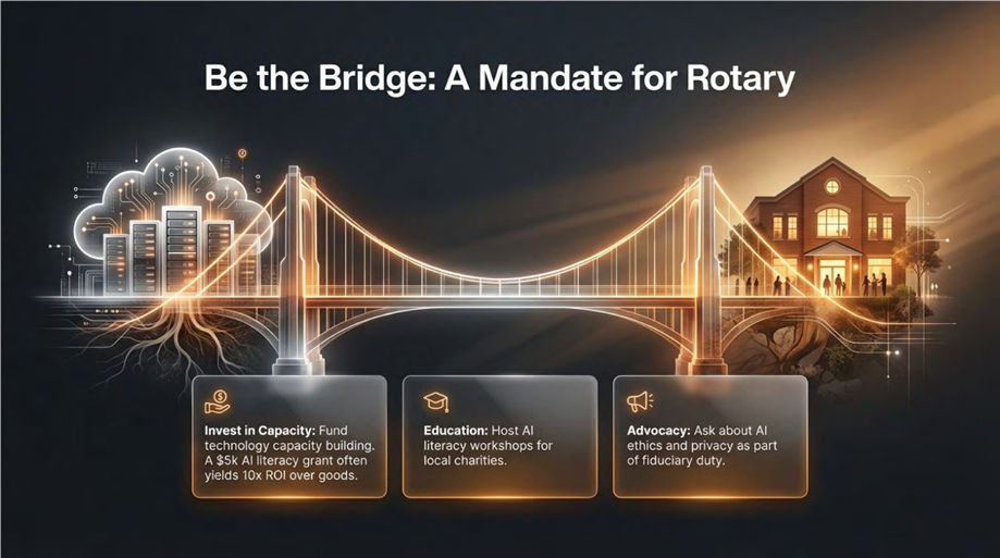 According to Bryan, just two months into the year, the structural shifts have been more disruptive and rapid than expected. We are now living in a new era of accelerating change unfolding at a dizzying pace each day. By the time a standard 20-minute Rotary presentation ends, over 1,000 new AI-driven tools will have been released worldwide, and with the new capabilities of tools such as Claude Code, these numbers will only increase. We are moving at lightning speed from "Assistive AI," chatbots that help us draft emails, to “Agentic AI." These autonomous agents operate under human-set goals, with the AI executing the entire workflow, from complex research to verification.