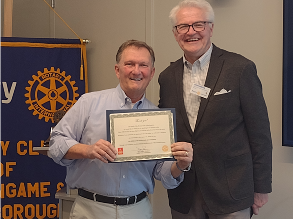 President Doug adjourned the meeting after thanking Bryan and presenting him with a certificate noting that Burlingame Rotary is donating polio doses in his name.