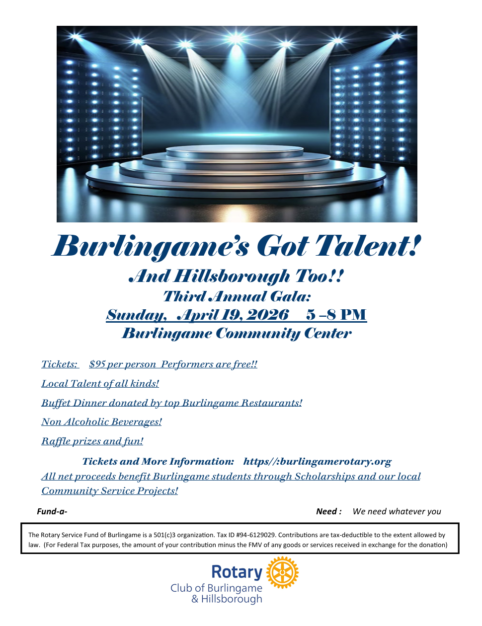 Burlingame’s Got Talent:Jerry Winges announced that the event will be held on April 19 at the Community Center. The committee is looking for additional folks to help on the committee as well as sponsor the event. Got talent? Think about signing up to perform!