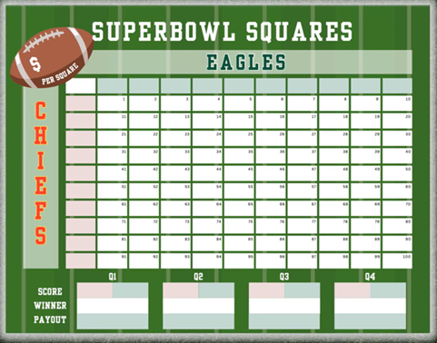 Jonnie Dukes is organizing an NFL pool. It’s $20/square, and there are 100 squares. The Club will keep half the proceeds, and the winners of each quarter will get one-quarter of the remaining funds. So, buy your squares NOW!