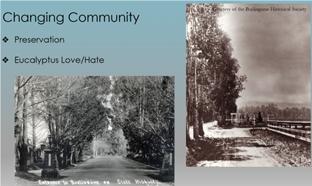 Lisa Goldman introduced Rich Holtz, the City of Burlingame’s Parks Superintendent and City Arborist. Rich reviewed the history of trees in Burlingame. Before development, there were few native trees. Once people started settling here, they planted trees, often to establish property lines or wind breaks.