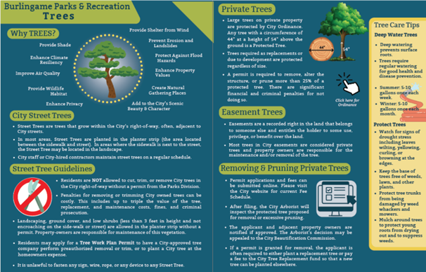 Protection of trees has been a longstanding practice in Burlingame. The City passed its first tree ordinance in 1911 to protect the trees on El Camino Real, and Burlingame has been a Tree City USA for 46 years.
