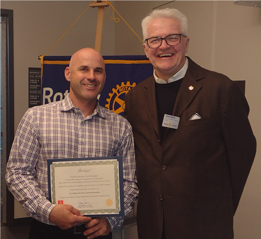 President Doug adjourned the meeting after thanking Rich and presenting him with a certificate noting that Burlingame Rotary is donating polio doses in his name.